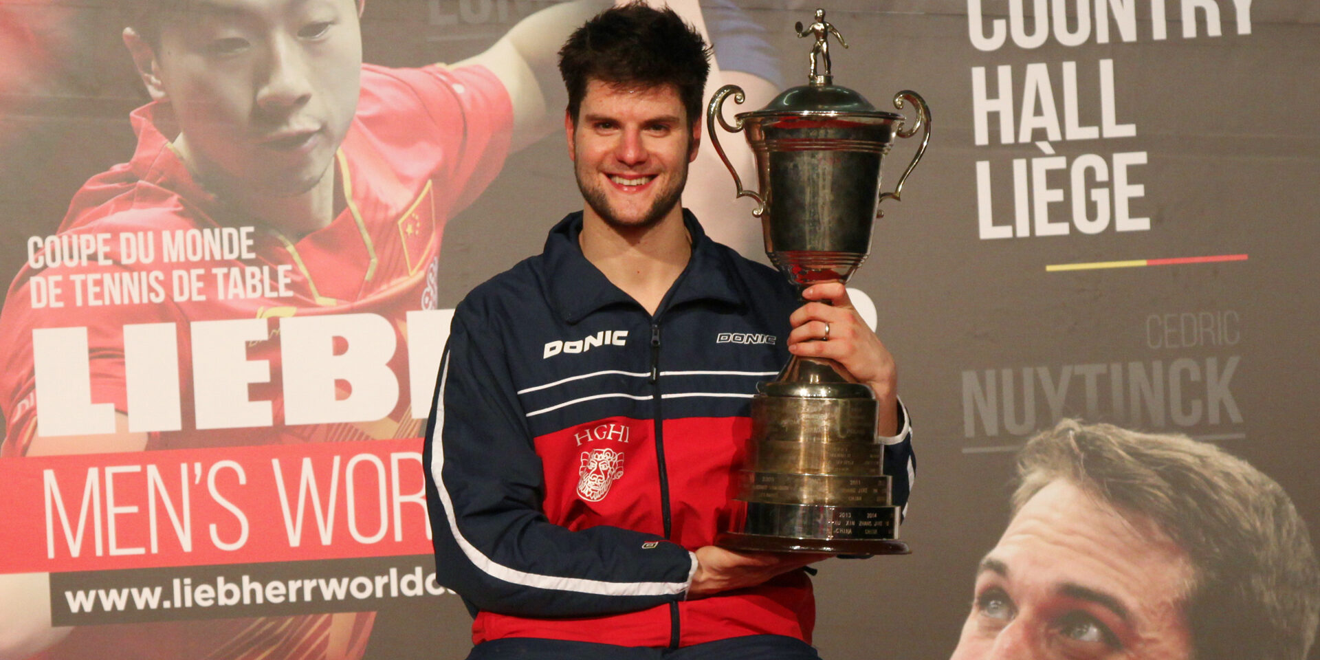 På billedet Dimitrij Ovtcharov efter triumfen i Liége i Belgien. Foto: ITTF.