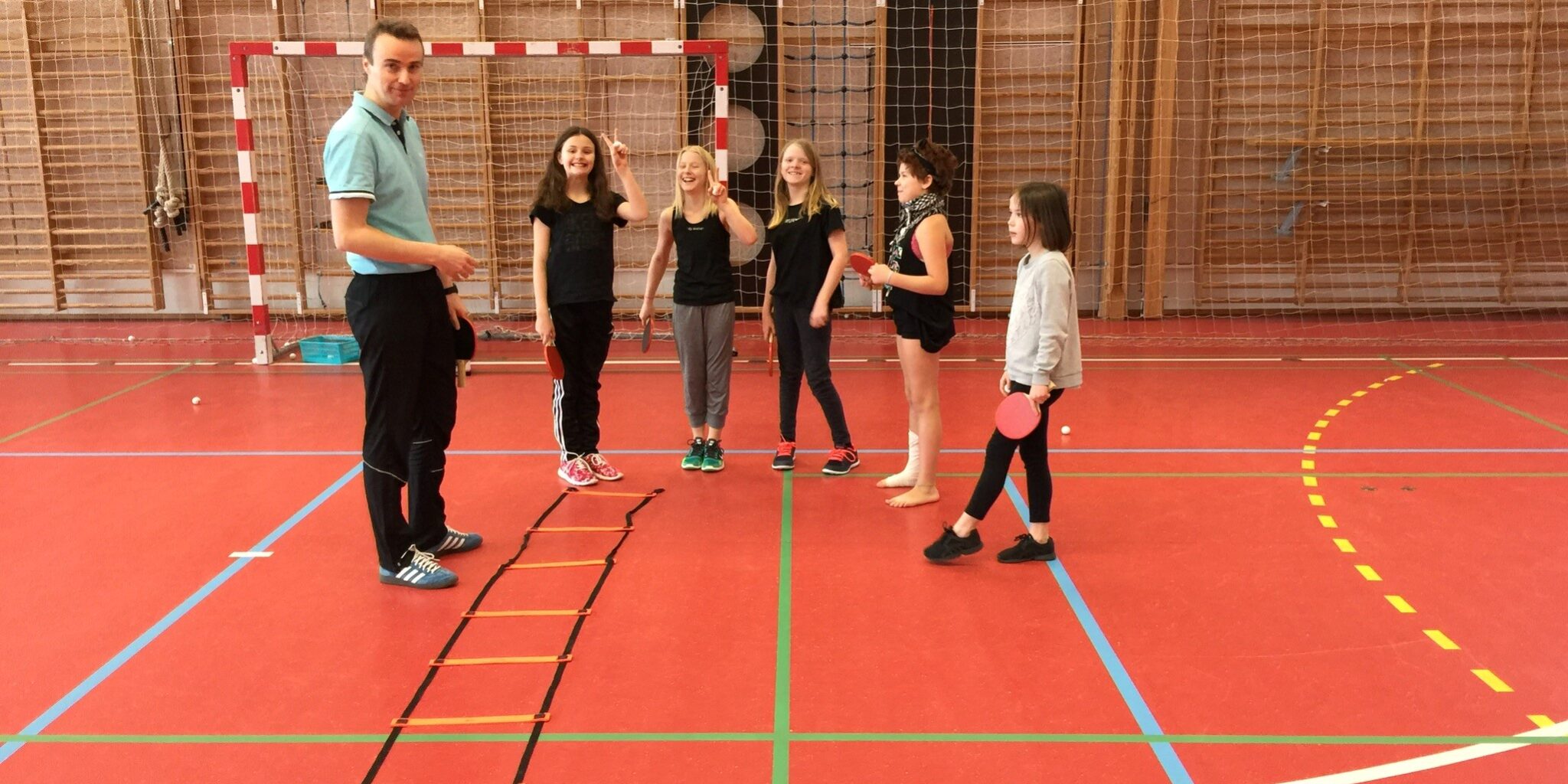 Kim Rosenquist viser på billedet nogle piger, hvordan en bordtennisopvarmning med stige kan være sjov og udfordrende på samme tid. Foto: Privat.
