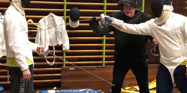 “Vi træner benarbejde i dybdeled og får lidt ny inspiration fra en anden vinkel”, forklarer Linus Mernsten, der til dagens træning med Jonathan Groth og Ibrahima Diaw havde indkaldt den svenske fægtemester og landstræner ved seks Olympiske Lege Orvar Jönsson, der selv deltog aktivt ved OL i Munchen i 1972.