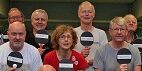 Furesø 60+ holdet med Gitte Schleimann Petersen i rød bluse i midten og deres træner yderst til højre melder sig klar til onsdagens duel i Frederiksborgcentret.