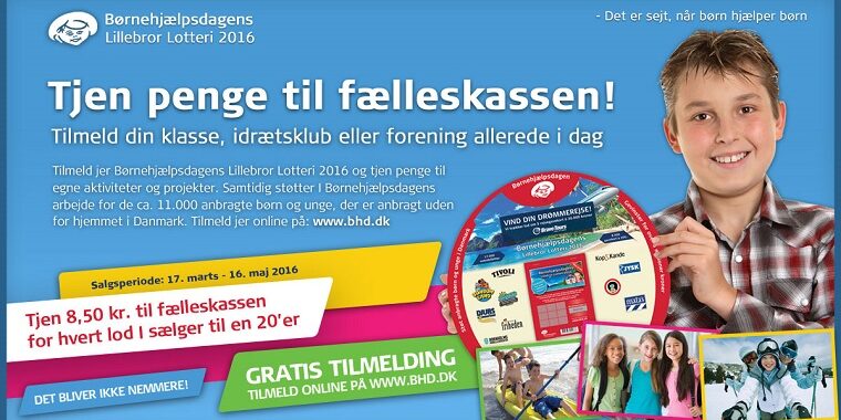 Den 17. marts er Børnehjælpsdagens traditionsrige Lillebror Lotteri igen på gaden. I løbet af foråret 2016 sælger foreninger, idrætsklubber og skoleklasser over hele landet Lillebror Lotteriet og tjener rigtig gode penge til klasse- og foreningskassen. De støtter samtidig Børnehjælpsdagens arbejde for Danmarks mange anbragte børn og unge.