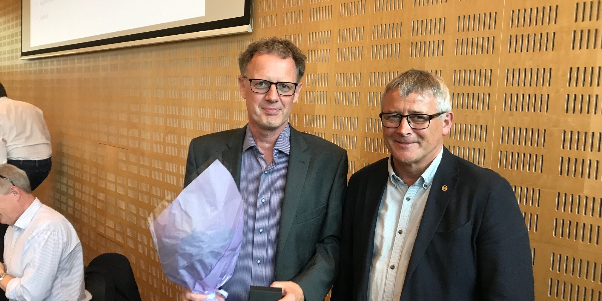 Ole Hückelkamp (tv.) får her overrakt beviset som årets leder af Asger Rasmussen fra bestyrelsen (th.). Med hæderen fulgte også 5.000,- kr. Foto: Carsten Egeholt.